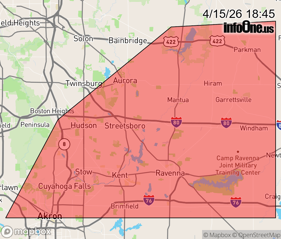 Canceled 4/15/26 7:11 PM Severe Thunderstorm Warning issued April 15 at 6:44PM EDT until April 15 at 7:15PM EDT by NWS Cleveland OH At 643 PM EDT, a severe thunderstorm was located over Mantua, or near Ravenna, moving east at 40 mph. HAZARD...60 mph wind gusts and quarter size hail. SOURCE...Radar indicated. IMPACT...Minor damage to vehicles is possible. Expect damage to trees and power lines. Locations impacted include... Akron, Ravenna, Cuyahoga Falls, Kent, Hudson, Twinsburg, Tallmadge, Streetsboro, Garrettsville, Mantua, Stow, Aurora, Brimfield, Munroe Falls, Parkman, Reminderville, Edinburg, Silver Lake, Windham, and Hiram. ![]() |