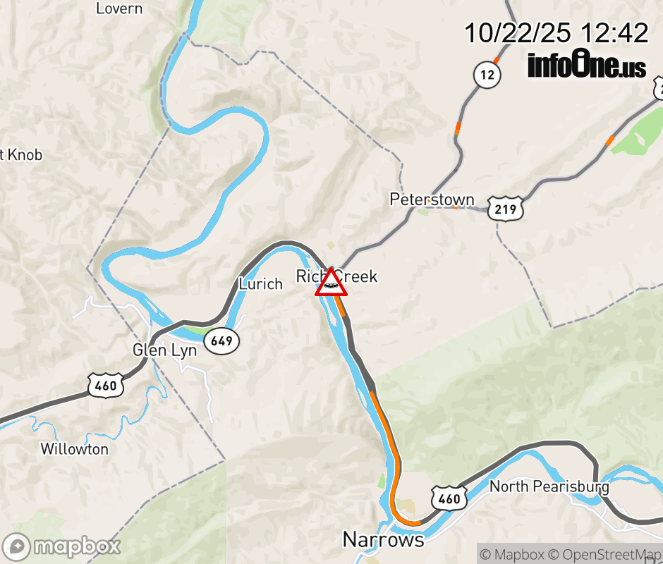 On US-460 in the Town of Rich Creek, in the vicinity of Old Virginia Ave, motorists can expect delays due to a vehicle crash. The west left shoulder and left lane are closed. ![]() |