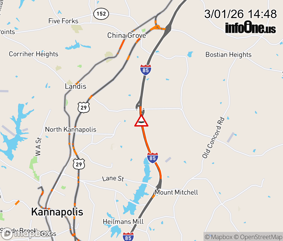 The left shoulder is closed at Exit 65 (Old Beatty Ford Rd). Updated: Sun 3/1/26 2:48 PM EST ![]() Updated: Sun 3/1/26 2:48 PM EST |