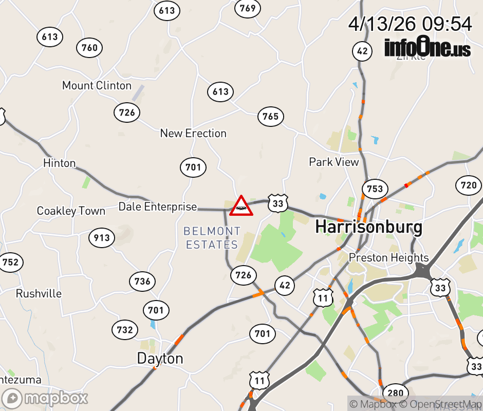 On Rt. 726 in the County of Rockingham, in the vicinity of Rawley Pike; US-33E/W;WEAVERS ROAD, motorists can expect delays due to a vehicle crash. All east lanes are closed. All west lanes are closed. Updated: Mon 4/13/26 9:54 AM EDT ![]() Updated: Mon 4/13/26 9:54 AM EDT |