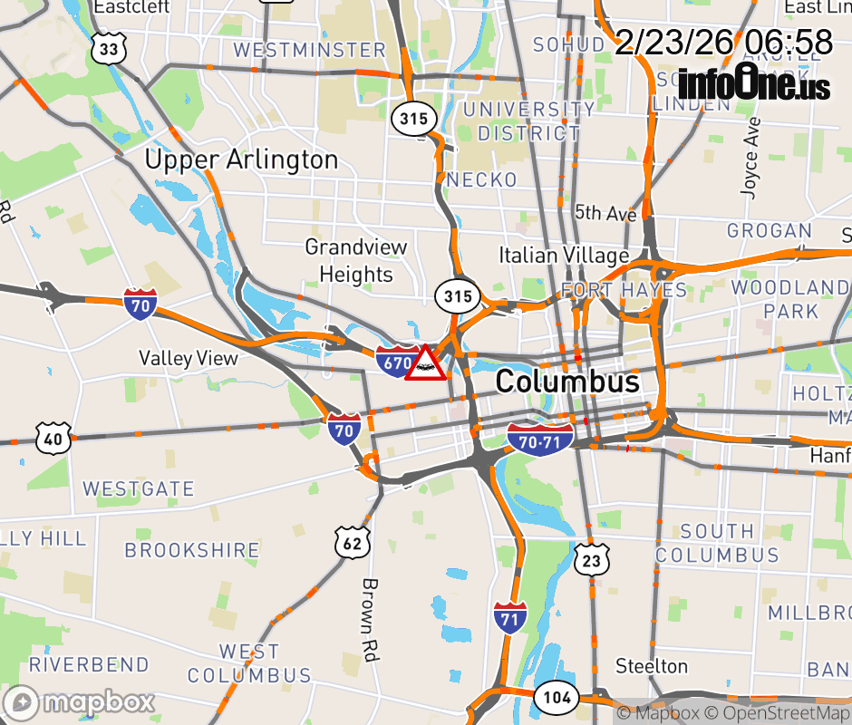 The left lane is blocked on I-670 East at US-33/SR-315 South, due to a crash. Updated: Mon 2/23/26 6:58 AM EST ![]() Updated: Mon 2/23/26 6:58 AM EST |