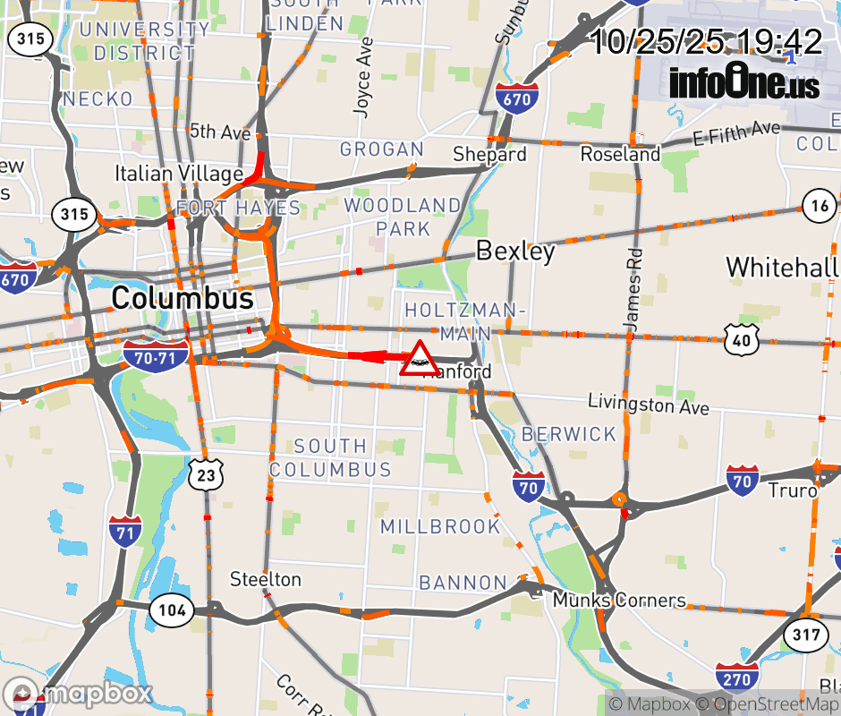 The 2 right lanes are blocked on I-70 West at Kelton Ave/Miller Ave, due to a crash. Updated: Sat 10/25/25 7:42 PM EDT ![]() Updated: Sat 10/25/25 7:42 PM EDT |