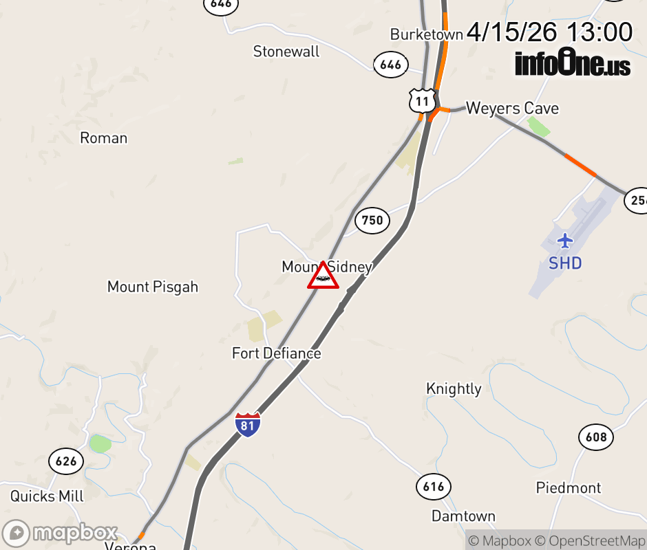 On US-11 in the County of Augusta, in the vicinity of Bolivar St; Mt Sidney School Ln, motorists can expect delays due to a vehicle crash. All south lanes are closed. Updated: Wed 4/15/26 1:00 PM EDT ![]() Updated: Wed 4/15/26 1:00 PM EDT |