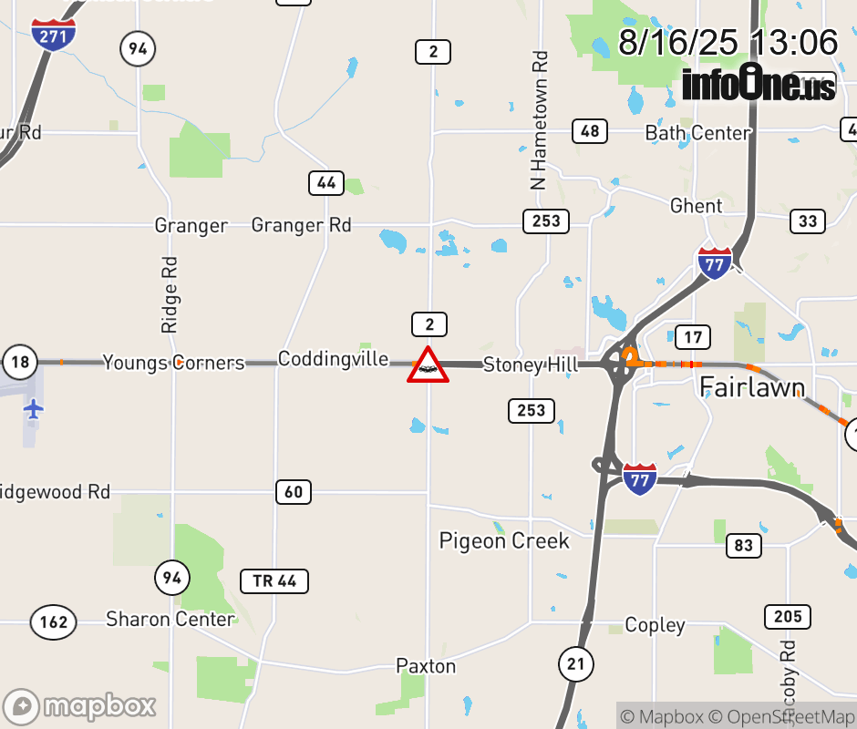 The right lane is blocked on SR-18 East at N Medina Line Rd, due to a crash. Updated: Sat 8/16/25 1:06 PM EDT ![]() Updated: Sat 8/16/25 1:06 PM EDT  |