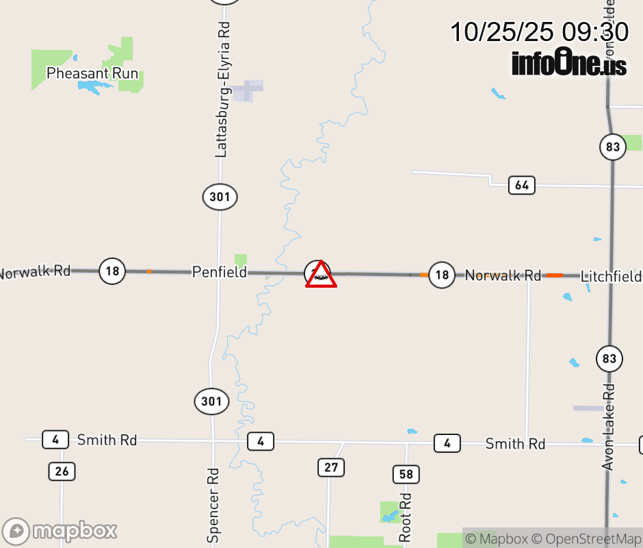 Expect lane closures on SR-18 in both directions at Foster Rd. (MM: 12.8), due to crash. Expect lane closures on SR-18 in both directions at Foster Rd. (MM: 12.8), due to crash. Updated: Sat 10/25/25 9:30 AM EDT ![]() Updated: Sat 10/25/25 9:30 AM EDT |