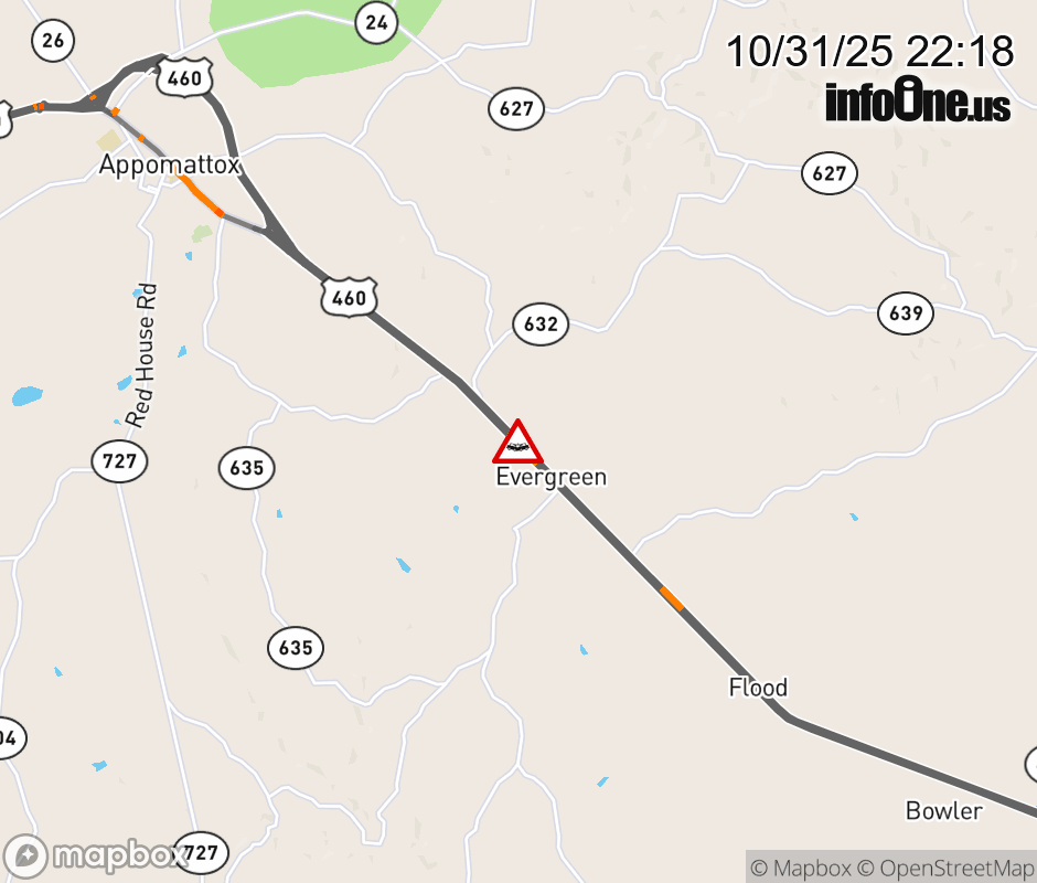 On US-460 West in the County of Appomattox, in the vicinity of Morning Star Rd; Rt. 634E/W (Appomattox County), motorists can expect delays due to a tractor trailer crash. Updated: Fri 10/31/25 10:18 PM EDT ![]() Updated: Fri 10/31/25 10:18 PM EDT |