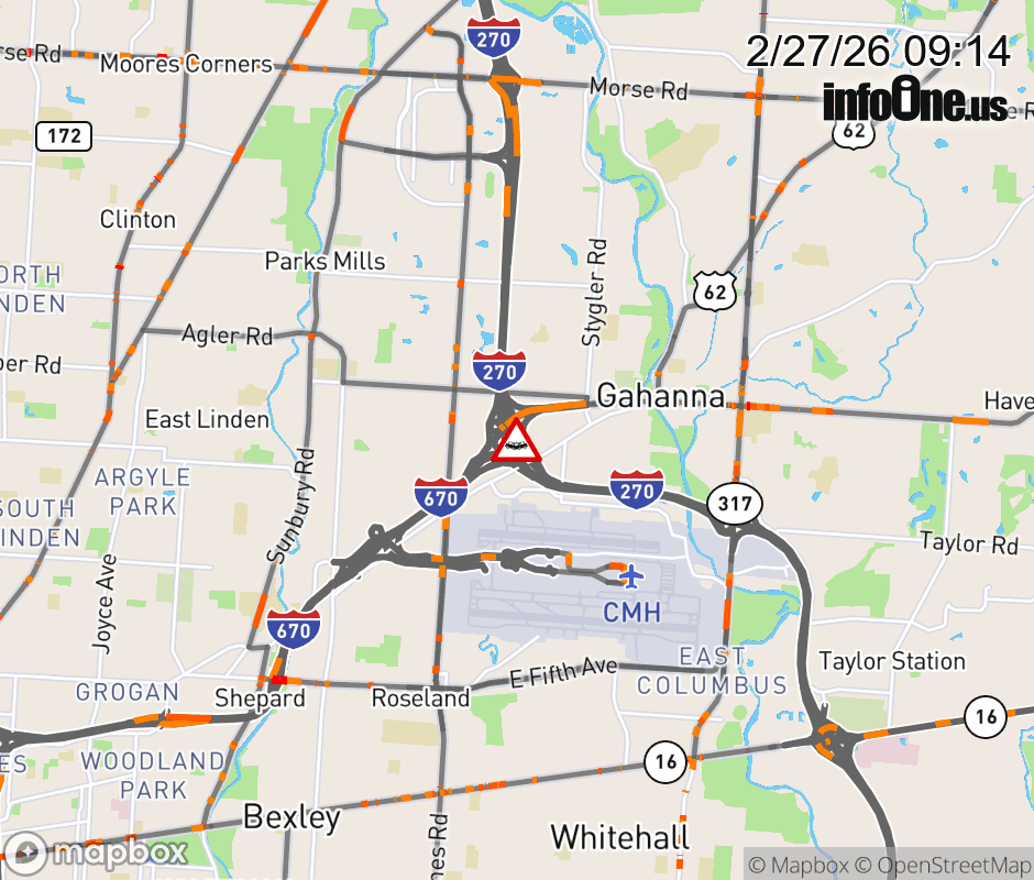 The left lane is blocked on Ramp I-670/US-62 East to I-270 North, due to a crash. Updated: Fri 2/27/26 9:14 AM EST ![]() Updated: Fri 2/27/26 9:14 AM EST |