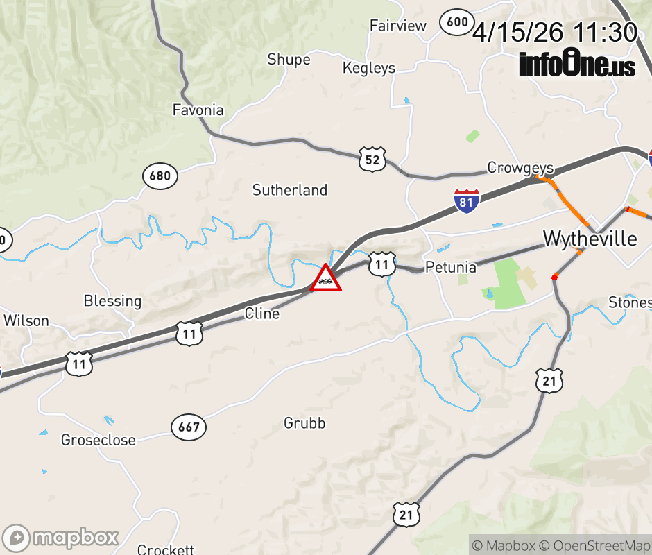 On I-81 South at mile marker 67.5 in the County of Wythe, motorists can expect delays due to a disabled vehicle. Updated: Wed 4/15/26 11:30 AM EDT ![]() Updated: Wed 4/15/26 11:30 AM EDT |