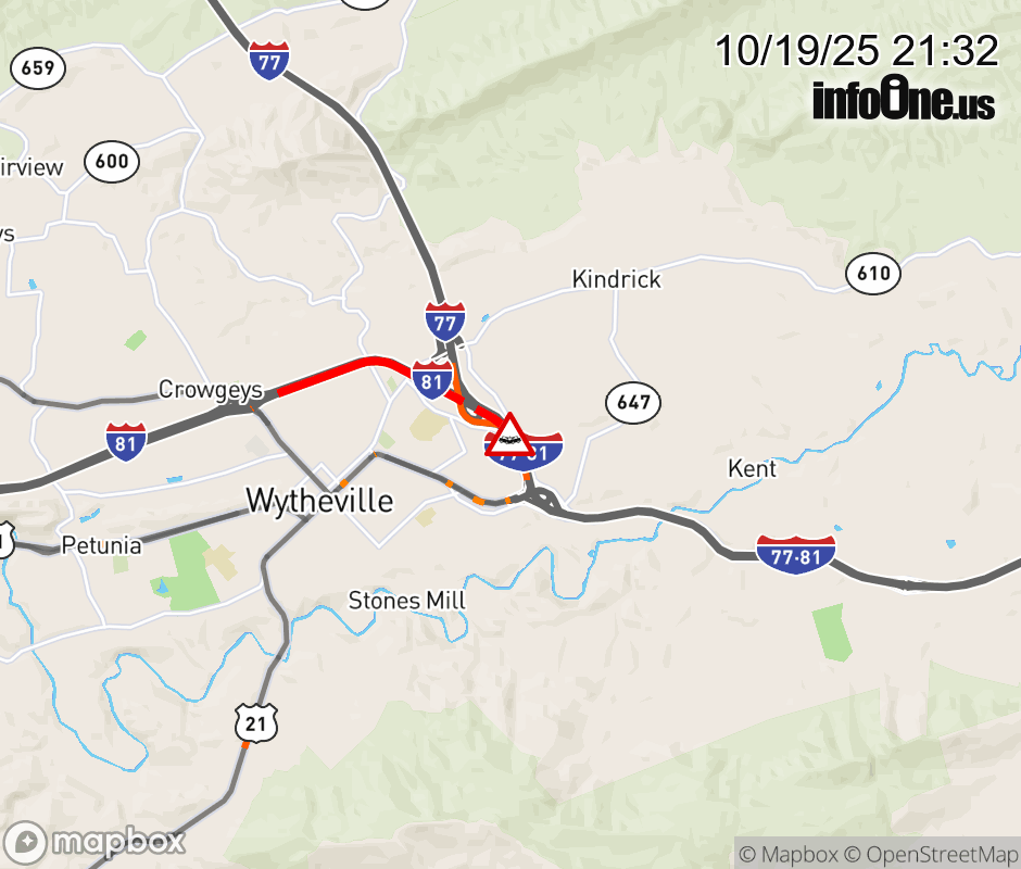 On I-81 at mile marker 73.4 in the County of Wythe, motorists can expect delays due to a tractor trailer crash. The north right shoulder is closed. Traffic backups are approximately 1.0 mile. Updated: Sun 10/19/25 9:32 PM EDT ![]() Updated: Sun 10/19/25 9:32 PM EDT |