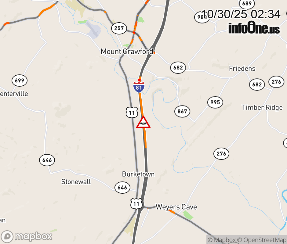 On I-81 at mile marker 237.8 in the County of Rockingham, motorists can expect delays due to a vehicle crash. The north left shoulder and left lane are closed. ![]() |