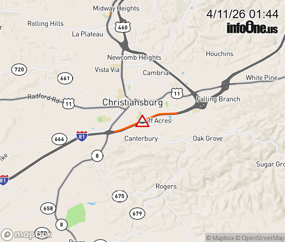 On I-81 at mile marker 115.5 in the County of Montgomery, motorists can expect delays due to a vehicle crash. The south right shoulder is closed. Updated: Sat 4/11/26 1:44 AM EDT ![]() Updated: Sat 4/11/26 1:44 AM EDT |