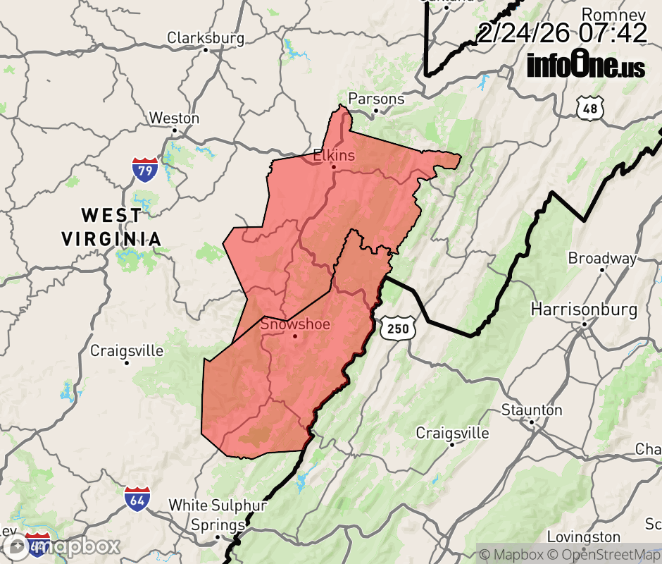 Canceled 2/24/26 12:42 PM Winter Weather Advisory issued February 24 at 7:40AM EST until February 25 at 1:00PM EST by NWS Charleston WV * WHAT... Snow expected. Total snow accumulations between 3 and 5 inches. Winds gusting as high as 40 mph. * WHERE... Northwest Pocahontas and Southeast Randolph Counties. * WHEN... From 9 PM this evening to 1 PM EST Wednesday. * IMPACTS... Plan on slippery road conditions. The hazardous conditions could impact the Wednesday morning commute. ![]() |
