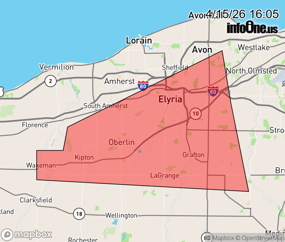 Canceled 4/15/26 4:30 PM Severe Thunderstorm Warning issued April 15 at 4:04PM EDT until April 15 at 4:30PM EDT by NWS Cleveland OH At 403 PM EDT, a severe thunderstorm was located 7 miles east of Wakeman, or 9 miles south of Vermilion, moving east at 55 mph. HAZARD...60 mph wind gusts and half dollar size hail. SOURCE...Radar indicated. IMPACT...People and animals outdoors will be injured. Expect hail damage to roofs, siding, windows, and vehicles. Expect damage to trees and power lines. Locations impacted include... Elyria, North Ridgeville, Grafton, Wakeman, Avon, Eaton, Oberlin, Lagrange, South Amherst, Pittsfield, Kipton, and Eaton Estates. ![]() |