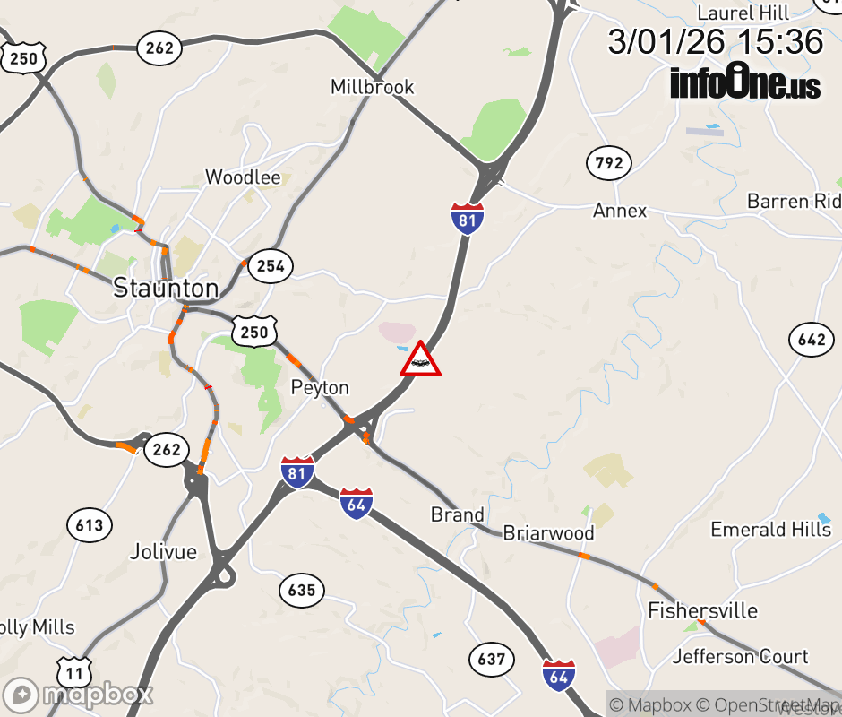 On I-81 South at mile marker 223.6 in the County of Augusta, motorists can expect delays due to a vehicle crash. Updated: Sun 3/1/26 3:36 PM EST ![]() Updated: Sun 3/1/26 3:36 PM EST |