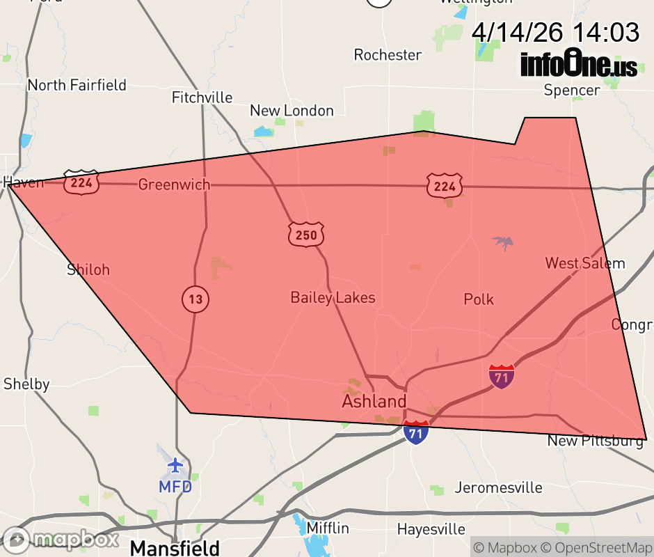 Canceled 4/14/26 2:30 PM Severe Thunderstorm Warning issued April 14 at 2:02PM EDT until April 14 at 2:30PM EDT by NWS Cleveland OH At 201 PM EDT, a severe thunderstorm was located over Savannah, or 7 miles northwest of Ashland, moving east at 55 mph. HAZARD...60 mph wind gusts and quarter size hail. SOURCE...Radar indicated. IMPACT...Minor damage to vehicles is possible. Expect damage to trees and power lines. Locations impacted include... Ashland, Plymouth, West Salem, Savannah, Polk, Sullivan, Greenwich, Bailey Lakes, Rowsburg, Nova, Nankin, Shenandoah, and Olivesburg. ![]() |