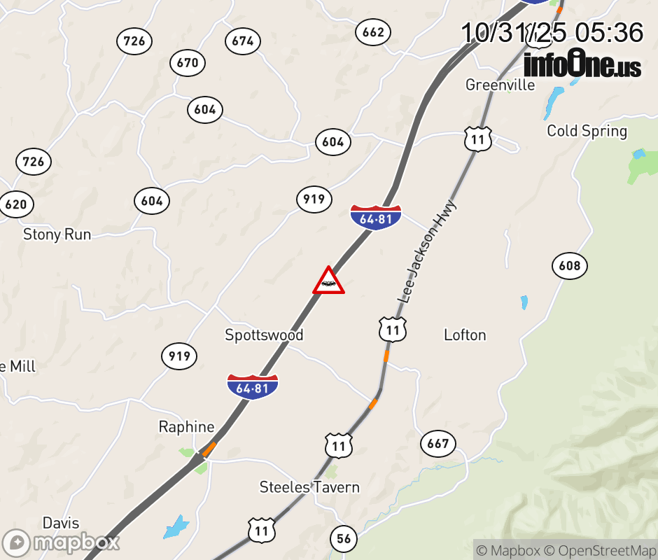 On I-81 at mile marker 208 in the County of Augusta, motorists can expect delays due to a vehicle crash. The north left shoulder is closed. Updated: Fri 10/31/25 5:36 AM EDT ![]() Updated: Fri 10/31/25 5:36 AM EDT |