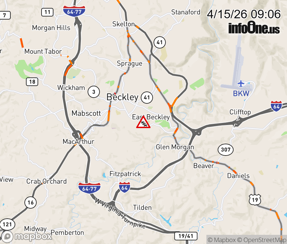 Road Closure on WV-3 (S Fayette St) & F St in Beckley. The eastbound road is closed. The westbound road is closed. Comments:Due to Utility Work in Area. Updated: Wed 4/15/26 9:06 AM EDT ![]() Updated: Wed 4/15/26 9:06 AM EDT |