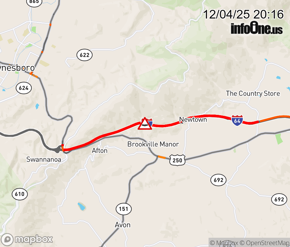 On I-64 West at mile marker 102.4 in the County of Albemarle, motorists can expect delays due to a multi-vehicle crash. Traffic backups are approximately 5.0 miles. Updated: Thu 12/4/25 8:16 PM EST ![]() Updated: Thu 12/4/25 8:16 PM EST |