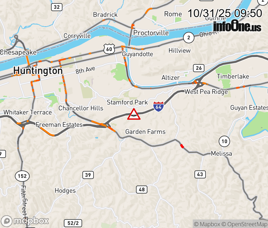 Vehicle Crash on I-64E at Mile Marker 12.0. The eastbound 2 left lanes are closed. Updated: Fri 10/31/25 9:50 AM EDT ![]() Updated: Fri 10/31/25 9:50 AM EDT |