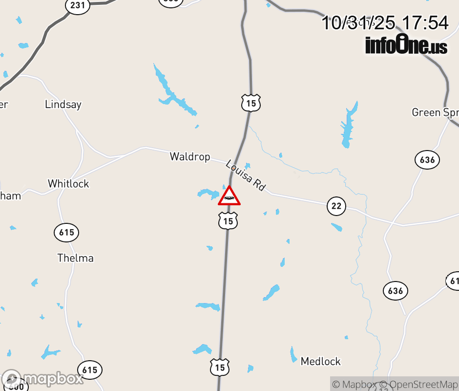 On US-15 in the County of Louisa, in the vicinity of Louisa Rd; VA-22E, motorists can expect delays due to a vehicle crash. All south lanes are closed. ![]() |