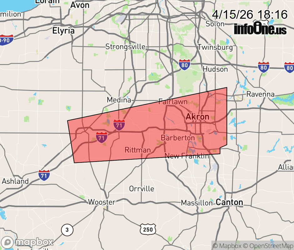 Canceled 4/15/26 6:27 PM Severe Thunderstorm Warning issued April 15 at 6:12PM EDT until April 15 at 7:00PM EDT by NWS Cleveland OH SVRCLE The National Weather Service in Cleveland has issued a * Severe Thunderstorm Warning for... Southern Medina County in northeastern Ohio... Southern Summit County in northeastern Ohio... Northern Wayne County in northeastern Ohio... * Until 700 PM EDT. * At 612 PM EDT, a severe thunderstorm was located over Lodi, or 10 miles southwest of Medina, moving east at 45 mph. HAZARD...60 mph wind gusts and half dollar size hail. SOURCE...Radar indicated. IMPACT...People and animals outdoors will be injured. Expect hail damage to roofs, siding, windows, and vehicles. Expect damage to trees and power lines. * Locations impacted include... Akron, Cuyahoga Falls, Kent, Barberton, Green, Wadsworth, Tallmadge, Rittman, Mogadore, Doylestown, Lodi, Creston, Chippewa Lake, Stow, New Franklin, Norton, Fairlawn, Munroe Falls, Lakemore, and Silver Lake. ![]() |