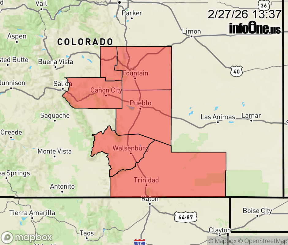 Canceled 2/27/26 6:00 PM Red Flag Warning issued February 27 at 11:36AM MST until February 27 at 6:00PM MST by NWS Pueblo CO * AFFECTED AREA... Fire Weather Zones 221, 222, 227, 228, 229 and 230. * WINDS... Northwest 10 to 20 mph with gusts up to 35 mph. * RELATIVE HUMIDITY... 5 to 10 percent. * IMPACTS... Fires will catch and spread quickly. Exercise extreme caution with any outdoor burning. ![]() |