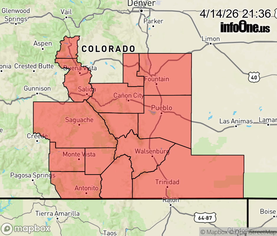Canceled 4/14/26 10:08 PM Fire Weather Watch issued April 14 at 7:35PM MDT until April 16 at 9:00PM MDT by NWS Pueblo CO * AFFECTED AREA... Fire Weather Zones 220, 221, 222, 224, 225 and 226. * TIMING... From Thursday morning through Thursday evening. * WINDS... Southwest 20 to 30 mph with gusts up to 50 mph. * RELATIVE HUMIDITY... As low as 9 percent. * IMPACTS... Elevated fire danger is expected. Fires will catch and spread rapidly and erratically. ![]() |