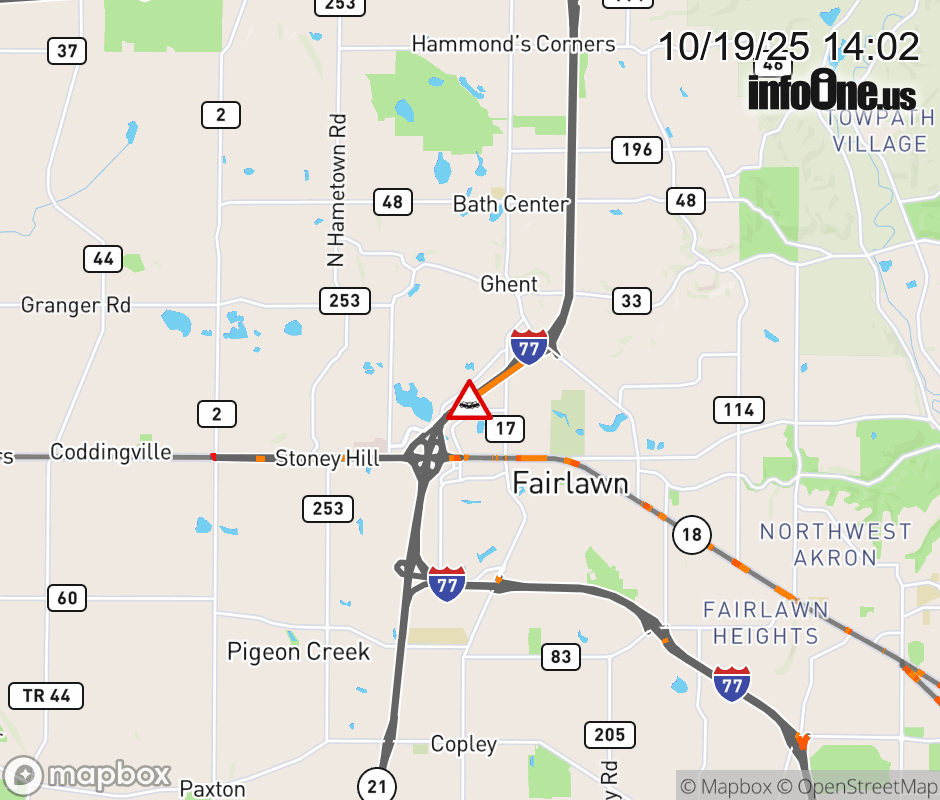 The right lane is blocked on I-77 North beyond SR-18 West, due to a crash. Updated: Sun 10/19/25 2:02 PM EDT ![]() |