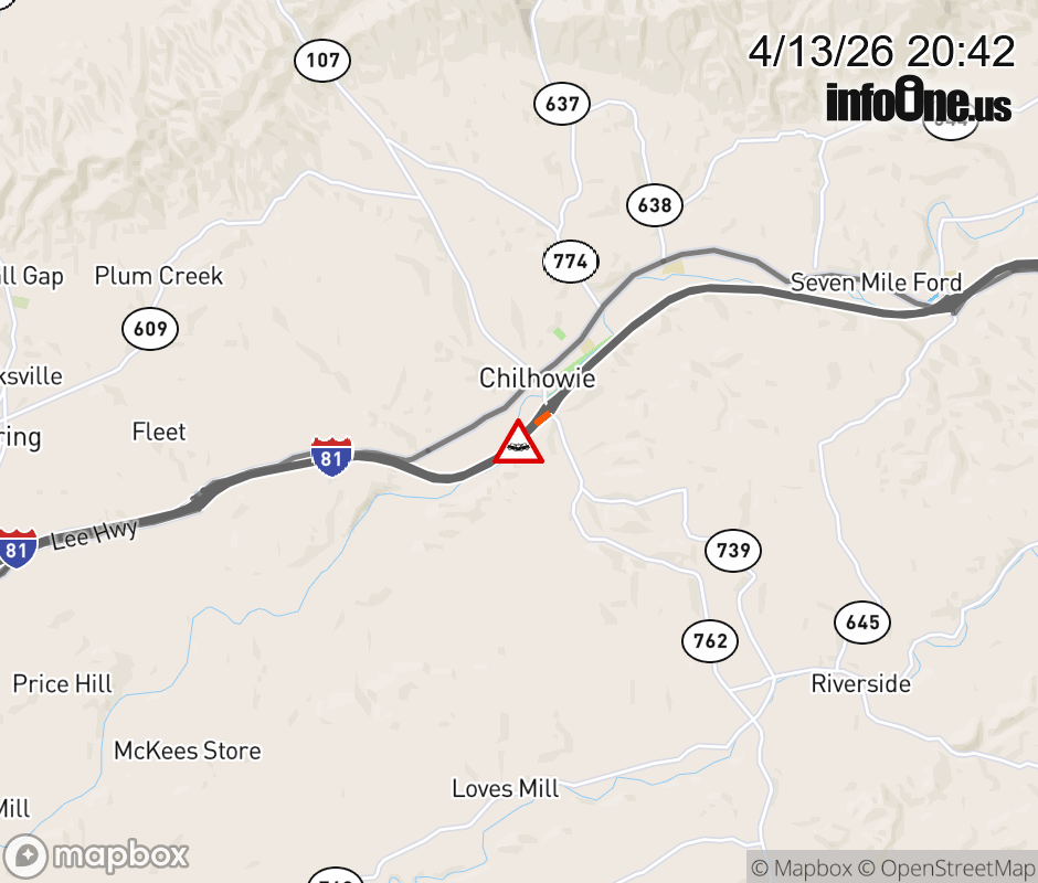 On I-81 at mile marker 35 in the County of Smyth, motorists can expect delays due to a vehicle crash. The north right shoulder is closed. ![]() |