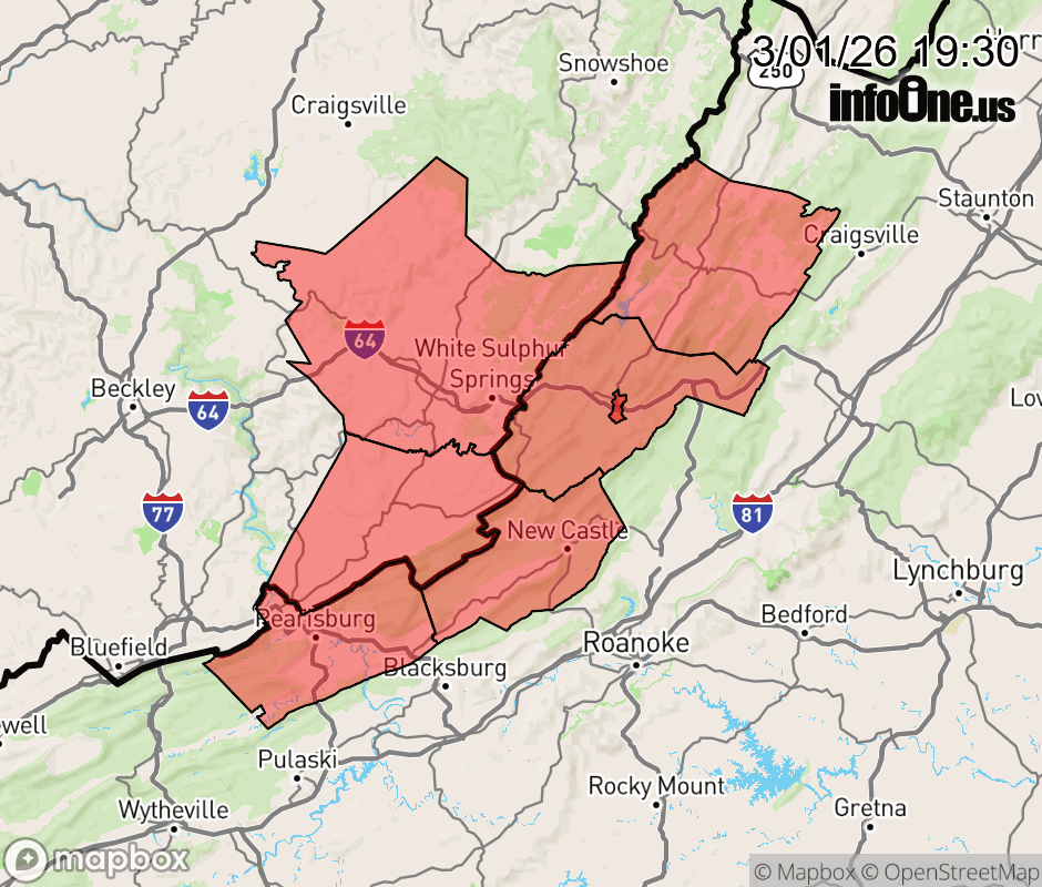 Winter Weather Advisory issued March 1 at 7:28PM EST until March 3 at 9:00AM EST by NWS Blacksburg VA * WHAT... Mixed precipitation expected. Total snow and sleet accumulations up to one inch and ice accumulations around one tenth of an inch. * WHERE... Portions of southwest and west central Virginia and southeast West Virginia. * WHEN... From 7 AM Monday to 9 AM EST Tuesday. * IMPACTS... Plan on slippery road conditions. The hazardous conditions could impact the Monday morning and evening commutes. ![]() |
