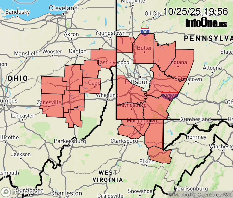 Canceled 10/26/25 4:28 AM Freeze Warning issued October 25 at 7:52PM EDT until October 26 at 9:00AM EDT by NWS Pittsburgh PA * WHAT... Sub-freezing temperatures as low as 30 expected. * WHERE... Portions of east central Ohio, southwest and western Pennsylvania, and northern West Virginia. * WHEN... From midnight tonight to 9 AM EDT Sunday. * IMPACTS... Frost and freeze conditions could kill crops, other sensitive vegetation and possibly damage unprotected outdoor plumbing. ![]() |