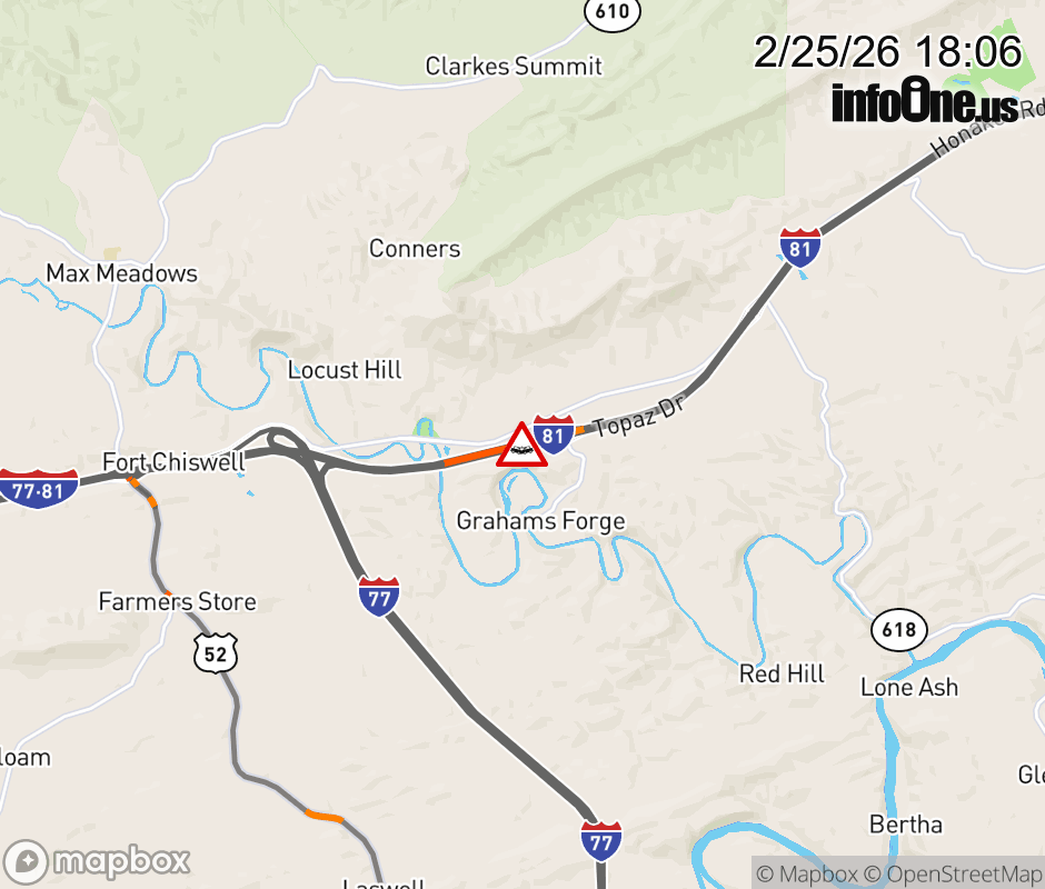 On I-81 at mile marker 83.7 in the County of Wythe, motorists can expect delays due to a tractor trailer crash. The south left shoulder and left lane are closed. Updated: Wed 2/25/26 6:06 PM EST ![]() Updated: Wed 2/25/26 6:06 PM EST |
