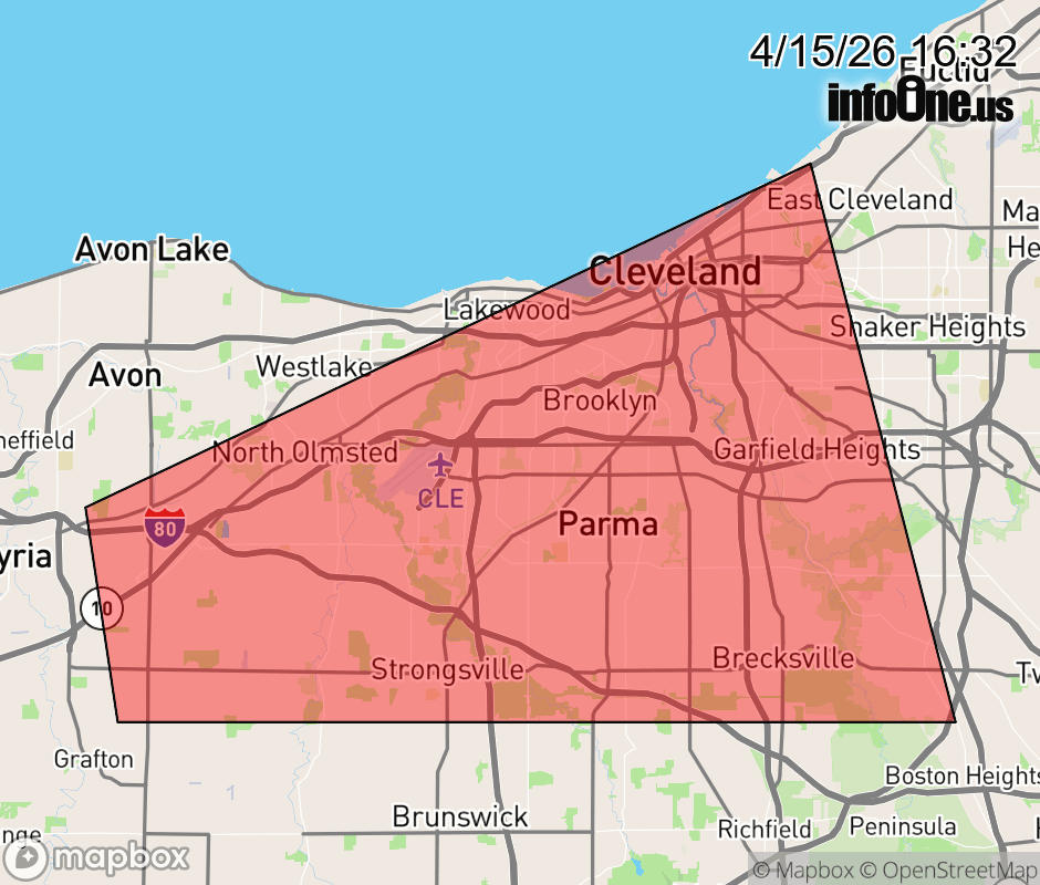 Canceled 4/15/26 4:49 PM Severe Thunderstorm Warning issued April 15 at 4:31PM EDT until April 15 at 5:15PM EDT by NWS Cleveland OH SVRCLE The National Weather Service in Cleveland has issued a * Severe Thunderstorm Warning for... Southwestern Cuyahoga County in northeastern Ohio... North central Summit County in northeastern Ohio... East central Lorain County in north central Ohio... * Until 515 PM EDT. * At 430 PM EDT, a severe thunderstorm was located near North Ridgeville, or 7 miles east of Elyria, moving east at 55 mph. HAZARD...60 mph wind gusts and quarter size hail. This storm may be rotating and has a history of producing a wall cloud. SOURCE...Radar indicated. IMPACT...Minor damage to vehicles is possible. Expect damage to trees and power lines. * Locations impacted include... Cleveland, Parma, Lakewood, Cleveland Heights, Strongsville, Westlake, North Royalton, North Ridgeville, Grafton, North Olmsted, Garfield Heights, Shaker Heights, Maple Heights, Parma Heights, Rocky River, Broadview Heights, Brook Park, Berea, Fairview Park, and Middleburg Heights. ![]() |