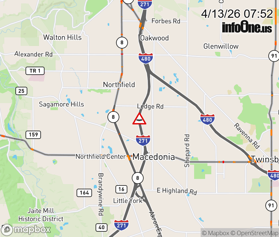 The right lane is blocked on I-271 North beyond SR-82 On-Ramp, due to a crash. Updated: Mon 4/13/26 7:52 AM EDT ![]() Updated: Mon 4/13/26 7:52 AM EDT |