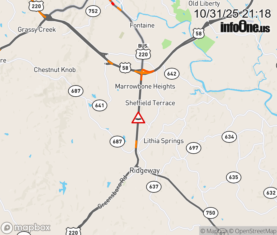 On US-220 in the County of Henry, in the vicinity of Mica Rd; Rt. 1059N/S (Henry County), motorists can expect delays due to a vehicle crash. All north lanes are closed. ![]() |