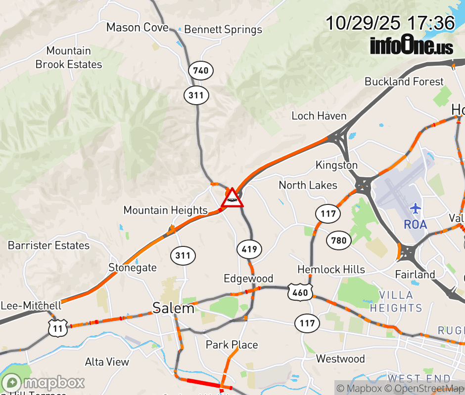 On I-81 at mile marker 141.5 in the County of Roanoke, motorists can expect delays due to a tractor trailer crash. The south exit 141 narrows. Traffic backups are approximately 1.0 mile. Updated: Wed 10/29/25 5:36 PM EDT ![]() Updated: Wed 10/29/25 5:36 PM EDT |