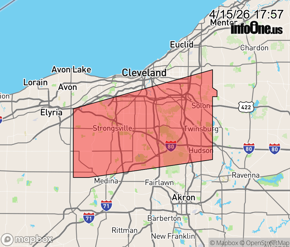 Canceled 4/15/26 6:20 PM Severe Thunderstorm Warning issued April 15 at 5:55PM EDT until April 15 at 6:30PM EDT by NWS Cleveland OH At 555 PM EDT, a severe thunderstorm was located near Strongsville, or 10 miles north of Medina, moving east at 50 mph. HAZARD...Ping pong ball size hail and 60 mph wind gusts. SOURCE...Radar indicated. IMPACT...People and animals outdoors will be injured. Expect hail damage to roofs, siding, windows, and vehicles. Expect damage to trees and power lines. Locations impacted include... Cleveland, Medina, Parma, Cuyahoga Falls, Strongsville, Brunswick, North Royalton, North Ridgeville, Solon, Hudson, Twinsburg, Streetsboro, Warrensville Heights, Macedonia, Grafton, South Russell, Highland Hills, Stow, North Olmsted, and Garfield Heights. ![]() |
