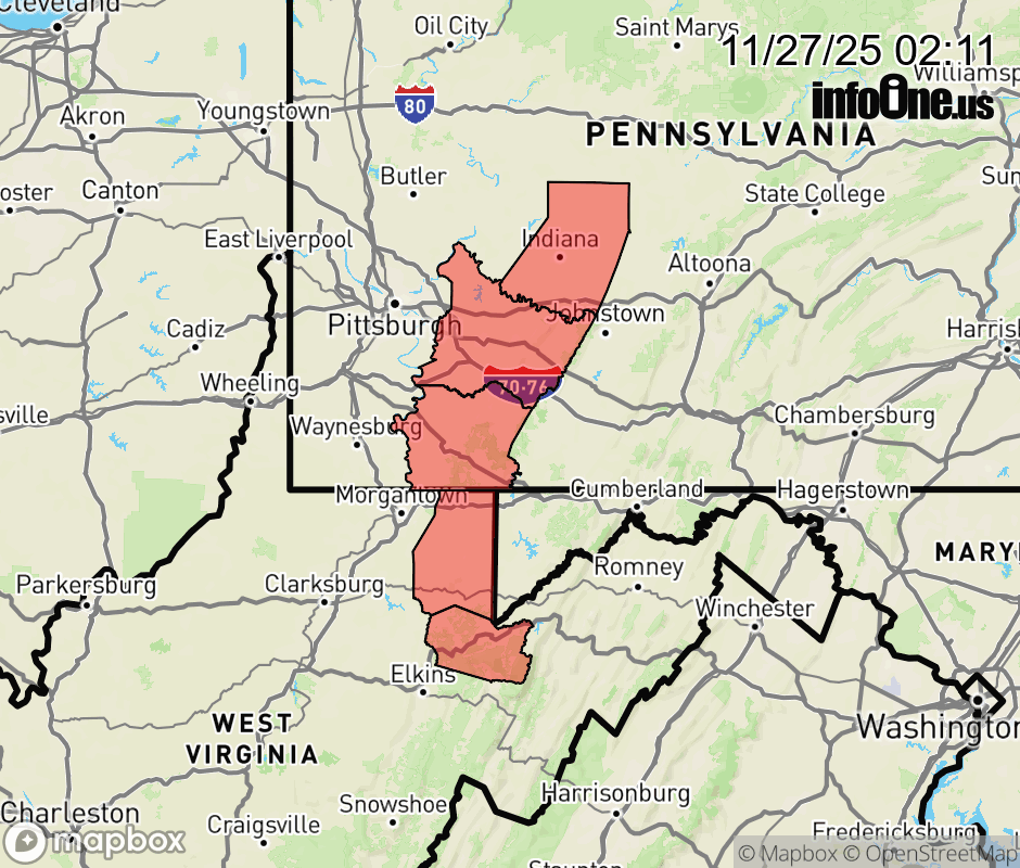 Canceled 11/27/25 11:00 AM Wind Advisory issued November 27 at 2:08AM EST until November 27 at 11:00AM EST by NWS Pittsburgh PA * WHAT... West winds 15 to 30 mph with gusts up to 50 mph expected. Gusts around 55 mph are expected for elevations above 4,000 feet across eastern Tucker county West Virginia. * WHERE... In Pennsylvania, Higher Elevations of Fayette, Higher Elevations of Westmoreland, and Higher Elevations of Indiana Counties. In West Virginia, Eastern Preston, and Tucker Counties. * WHEN... Until 11 AM EST this morning. * IMPACTS... Gusty winds will blow around unsecured objects. Tree limbs could be blown down and a few power outages may result. ![]() |