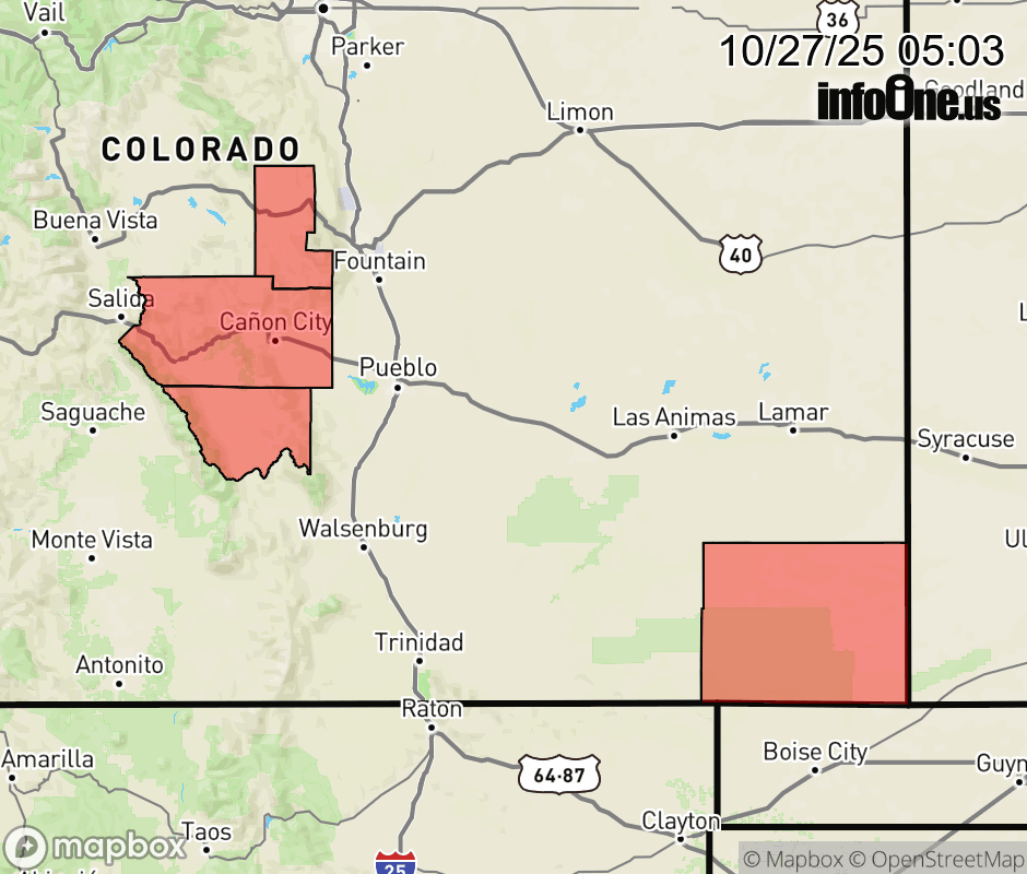 Canceled 10/27/25 1:35 PM Freeze Watch issued October 27 at 3:01AM MDT until October 29 at 10:00AM MDT by NWS Pueblo CO * WHAT... Sub-freezing temperatures as low as 15 possible. * WHERE... Baca County, and Canon City Vicinity/Eastern Fremont County. * WHEN... From Tuesday evening through Wednesday morning. * IMPACTS... Frost and freeze conditions could kill crops, other sensitive vegetation and possibly damage unprotected outdoor plumbing. ![]() |