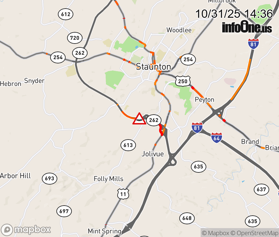 On VA-262 West in the County of Augusta, in the vicinity of the ramp, motorists can expect delays due to a vehicle crash. Updated: Fri 10/31/25 2:36 PM EDT ![]() Updated: Fri 10/31/25 2:36 PM EDT |