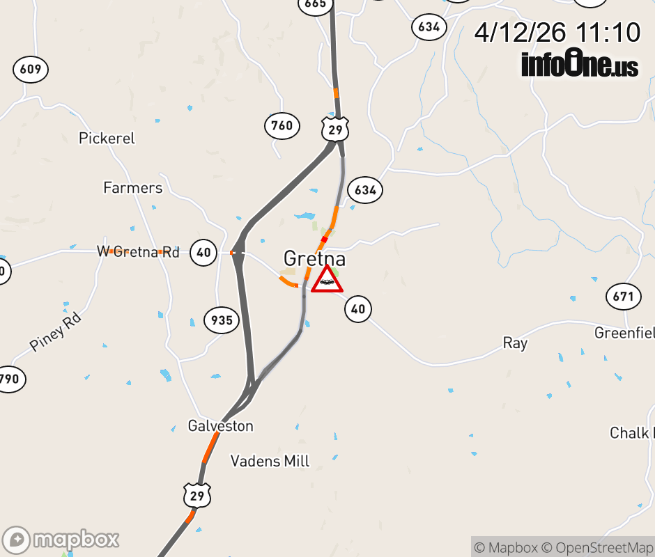 On Rt. 1308 North in the County of Pittsylvania, in the vicinity of Smith Ln; Rt. 1330N/S (Pittsylvania County), motorists can expect delays due to a vehicle crash. Lane closures exist. Updated: Sun 4/12/26 11:10 AM EDT ![]() Updated: Sun 4/12/26 11:10 AM EDT |