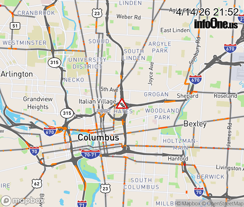 The right lane is blocked on I-670 West beyond I-71 North/South, due to repairs/maintenance. ![]() Updated: Tue 4/14/26 9:52 PM EDT |