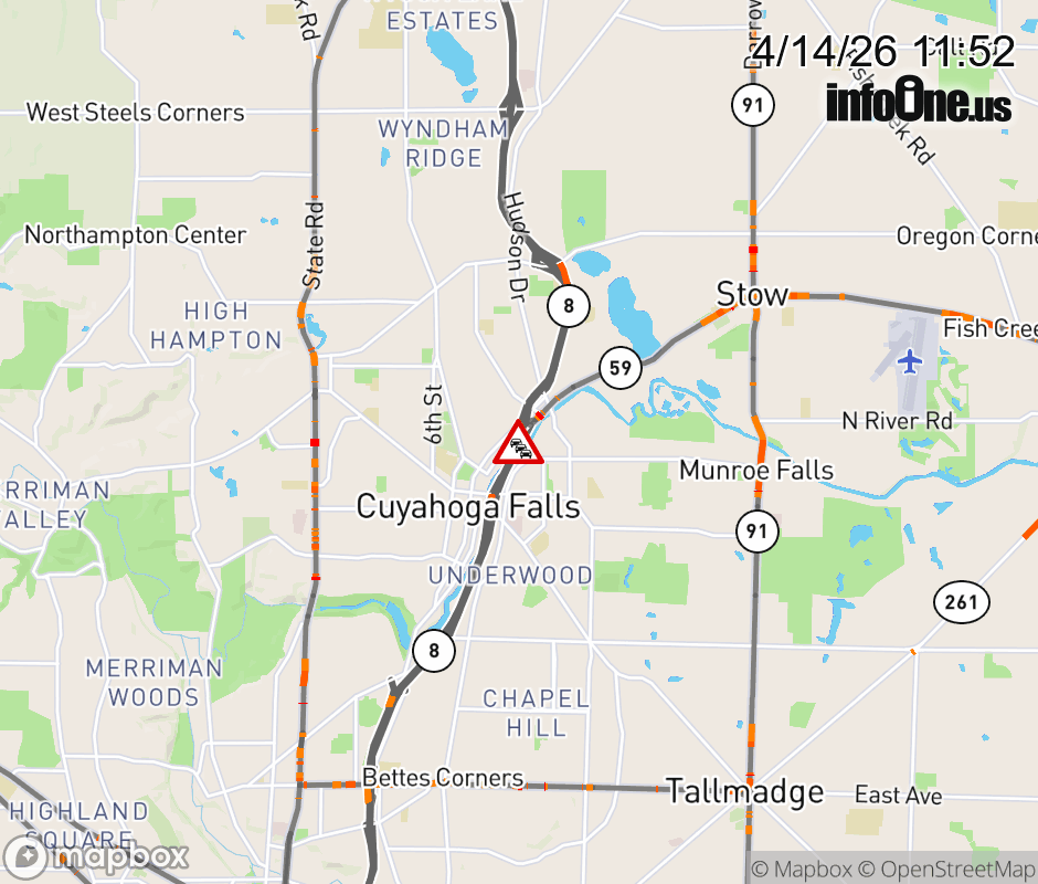 Expect lane closures on SR-8 in both directions from Front St/Second St to 0.3 miles beyond Graham Rd. (MM: 6.1), due to repairs/maintenance. Updated: Tue 4/14/26 11:52 AM EDT ![]() Updated: Tue 4/14/26 11:52 AM EDT |