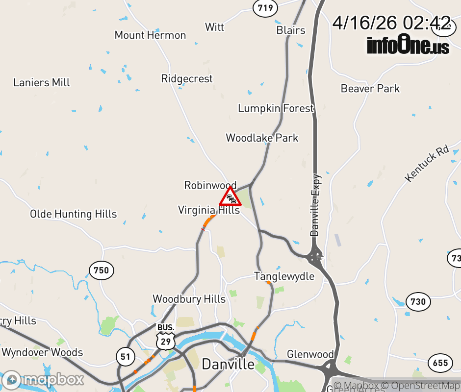 On VA-41 in the County of Pittsylvania, in the vicinity of Robertson Ln; Rt. 863N/S (Pittsylvania County); /ROBERTSON LANE, motorists can expect delays due to an incident. All north lanes are closed. All south lanes are closed. ![]() |