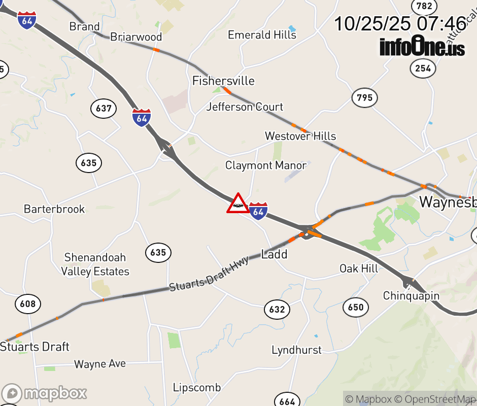 On I-64 at mile marker 93.2 in the County of Augusta, motorists can expect delays due to a vehicle crash. The west left shoulder is closed. Updated: Sat 10/25/25 7:46 AM EDT ![]() Updated: Sat 10/25/25 7:46 AM EDT |