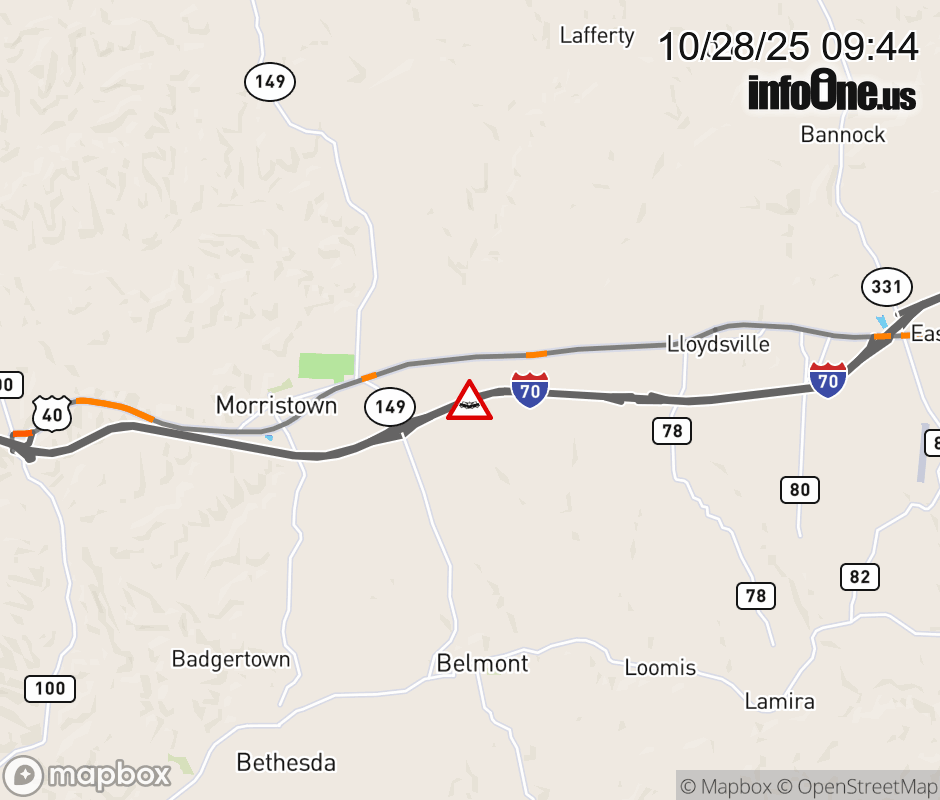 The right shoulder is blocked on I-70 East beyond SR-149/Belmont/Morristown, due to a crash. ![]() |