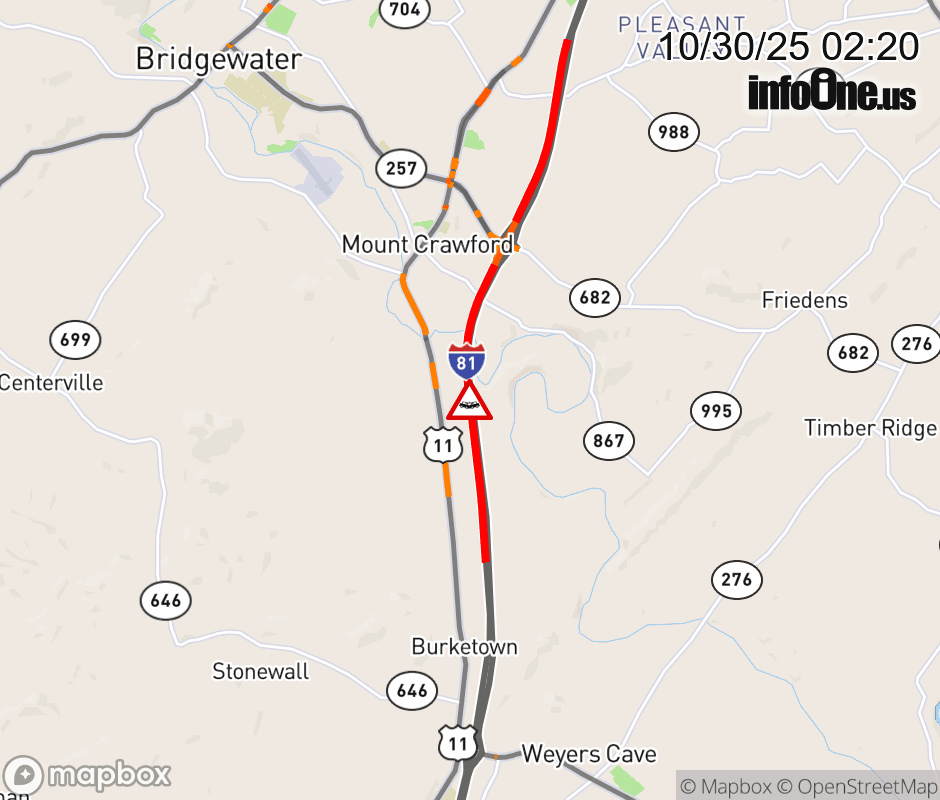 On I-81 South at mile marker 238.5 in the County of Rockingham, motorists can expect delays due to a vehicle crash. Updated: Thu 10/30/25 2:20 AM EDT ![]() Updated: Thu 10/30/25 2:20 AM EDT |