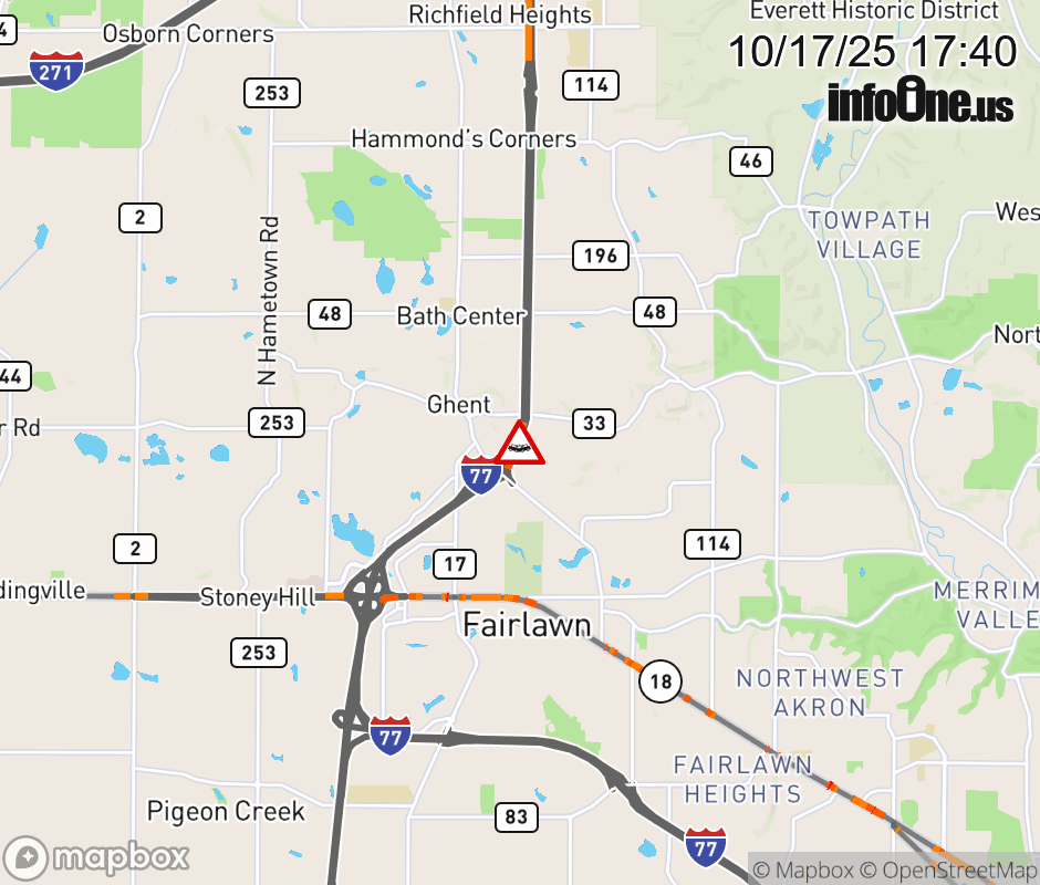 The left lane is blocked on I-77 North beyond Ghent Rd, due to a crash. Updated: Fri 10/17/25 5:40 PM EDT ![]() |