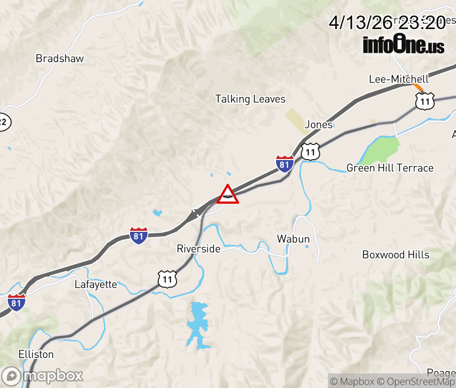 On I-81 at mile marker 132.9 in the County of Roanoke, motorists can expect delays due to a vehicle crash. The north right shoulder is closed. Updated: Mon 4/13/26 11:20 PM EDT ![]() Updated: Mon 4/13/26 11:20 PM EDT |