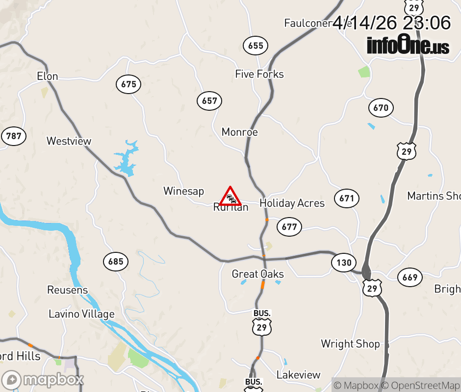 On Rt. 675 in the County of Amherst, in the vicinity of Mountainview Dr; Nottingham Pl; Winesap Rd; Rt. 1319N/S (Amherst County); Rt. 796N/S (Amherst County), motorists can expect delays due to weather. All east lanes are closed. All west lanes are closed. Updated: Tue 4/14/26 11:06 PM EDT ![]() Updated: Tue 4/14/26 11:06 PM EDT |